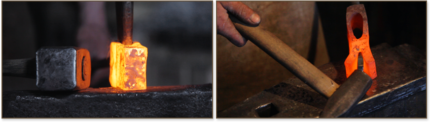 The first step is to chisel a hole in a block of mild low carbon steel. This is where the eye will take place. Using a mandrel the eye is stretched into the needed size. Next a notch is chiselled in one end of the billet and a wedge shaped peace of alloyed Bohler K460 tool steel is inserted in it to form the harder cutting edge. Now the axe is heated to a dark yellow color and borax is sprinkled on it. Melted borax liquefies the oxidation scale and washes it out of the welding seam. Once again the axe is heated, this time to a bright yellow glow, and forged so that the two pieces of steel forge weld together. The blacksmith then forges the axe’s head into a shape and grinds the rough edge. Now the axe is ready to be annealed.