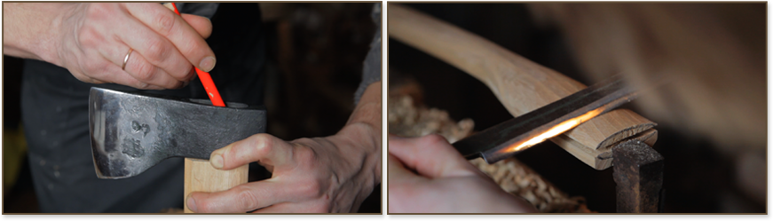 Each axe handle is made individually for each axe head to achieve a perfect fit. To start, a knot-free piece, of  locally harvested and kiln dryed (6-8% of moisture)  Red Elm wood is chosen and then marked out using a template.  We use only parallel grained wood to the axe eye, if the grain of the wood will be perpendicular to the axe eye - it will brake fast and will not last long. The rough shape of the handle is sawn using a bandsaw. Next the handle is shaped using a drawknife. Axe eye dimensions are marked on the top of the handle and the handle is shaved to almost fit the eye. Final finishing is carried out using sandpaper to ensure a close fit. Then the axe handle is tightly punched into the axe head and locked with the wooden wedge which is glued in with an epoxy wood glue.  A small steel wedge is hammered into the wooden wedge to lock the axe head vertically. Now the axe has been laid in the Tung oil bath for 24 hours, this fills the wood pores with the oil, and swells the handle so after a week the oil dries and polymerizes and wood is fully protected and it will never shrink.