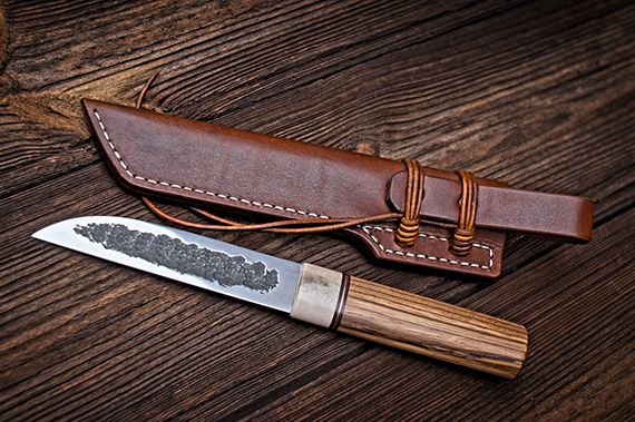 Handle material: Stabilized Zebrano Wood, Elk Antler, Full Grain Leather, Antique Bronze.