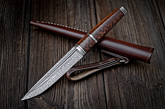 Handle material: Stabilized Turkish Walnut, Stabilized Moose Antler, Antique Bronze, Leather
