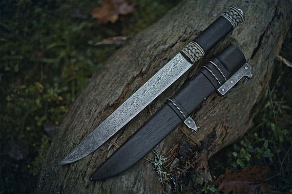 Handle and scabbard materials: 5600 years old English Boog oak, Sterling silver, Moose antler, cow hide leather.